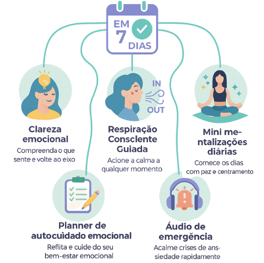Criamos este programa com base no que realmente funciona para a vida real de quem sente ansiedade, estresse, insônia e cansaço emocional. Tudo foi desenhado para caber na sua rotina, mesmo que você não tenha tempo, nunca tenha feito terapia ou se sinta sobrecarregada(o) demais para começar algo novo.